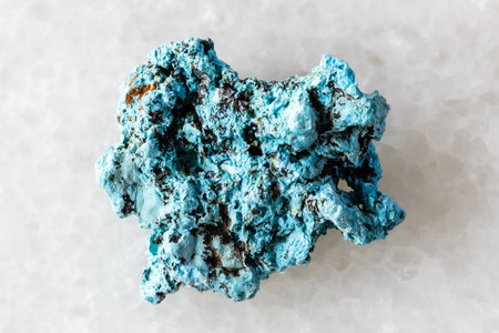 sample of raw shattuckite mineral on white marble background close up from Katanga, Congo