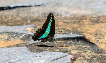A common bluebottle, Graphium sarpedon, drinks water from the bed of a shallow river in a park in Sasebo, Japan.