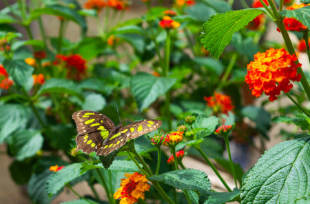 Green Butterfly Siproeta Stelenes on Orange Flower Common Lantana Close Up