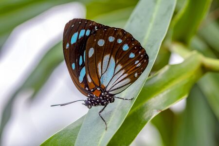 Butterfly on a green leaf in a botanical garden.