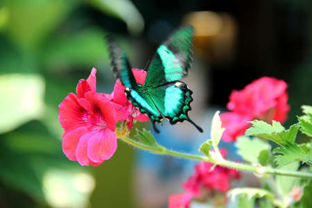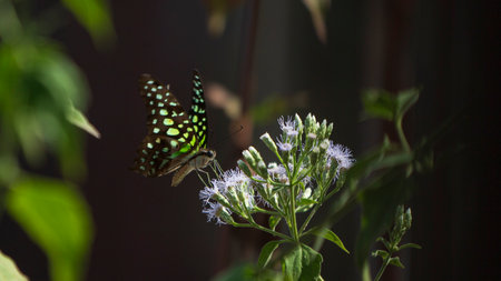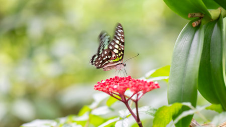 Tailed jay or Graphium agamemnon butterfly moving wings and feeding on red flowers in garden with blur foliage bokeh background.