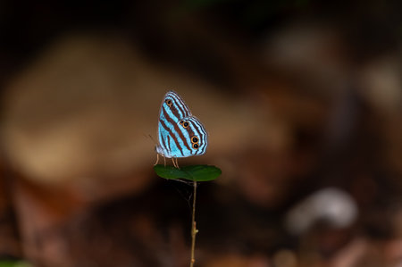 Brightly lit, unusual blue striped butterfly contrasted against the darkness of the rainforest