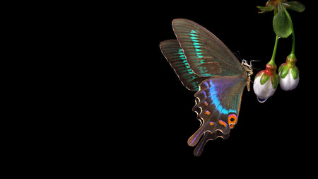 Butterfly and flower isolated on black background with copy space.