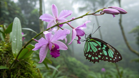 butterfly on a purple orchid in a tropical rainforest