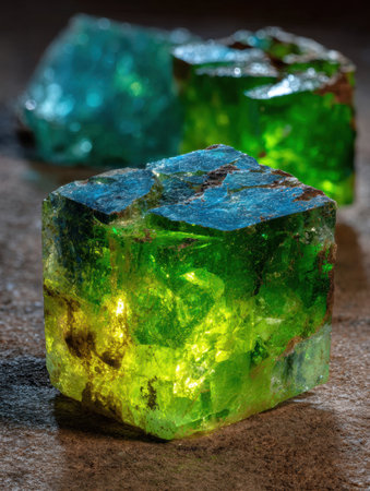 Bright green and blue crystals are placed on a textured surface, showing their color and faceted structures under natural light, creating a vibrant display.