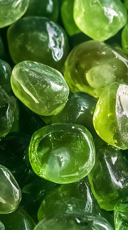 A macro close-up shows a dense cluster of polished green glass stones, creating a vibrant, textured surface with brilliant reflections. The smooth texture invites touch.