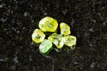 sample of raw peridot gemstones on black granite background close up from USA