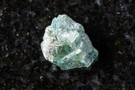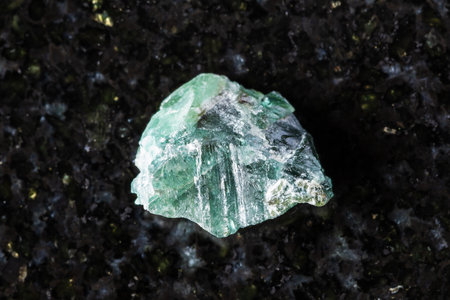 sample of raw green alexandrite mineral in daylight on black granite background close up from Ural, Russia
