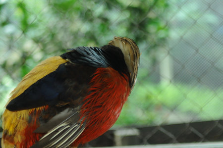 Golden pheasant in a cage at the bird park, Thailand.