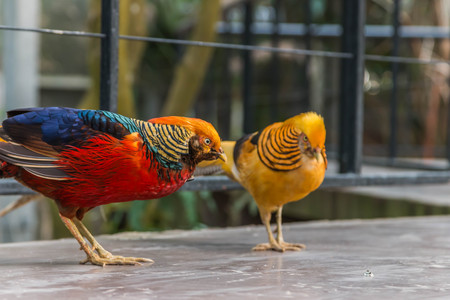 Golden pheasants on the ground in enclosure at the zoo, colorful birds portrait