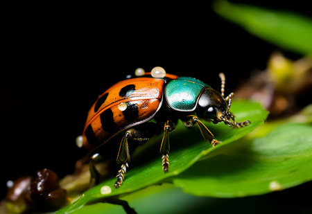A vibrant beetle perched gracefully on a lush green leaf, showcasing intricate patterns and colors. This close-up captures the essence of nature's beauty and diversity.