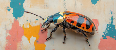 A colorful beetle with orange, black, and blue markings crawls across a textured, painted surface with a vibrant, abstract design.