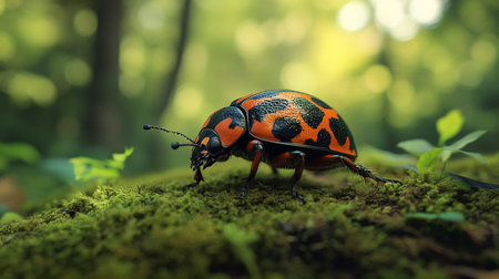 A stunning macro shot of a colorful beetle resting on a mossy log, showcasing intricate details and vibrant colors that highlight nature's beauty.
