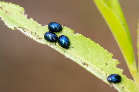 Macro Nature photography sky blue leaf bug. Chrysolina coerulans.