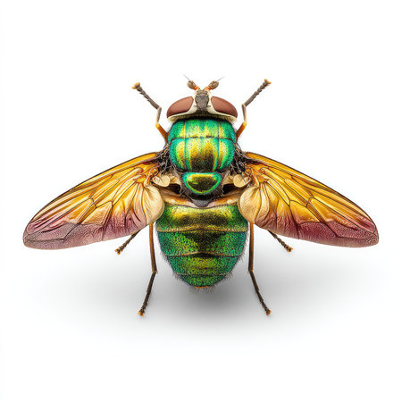 This stunning close-up image showcases a colorful fly, highlighting intricate details and vibrant colors against an isolated background. Perfect for nature enthusiasts and educational purposes.