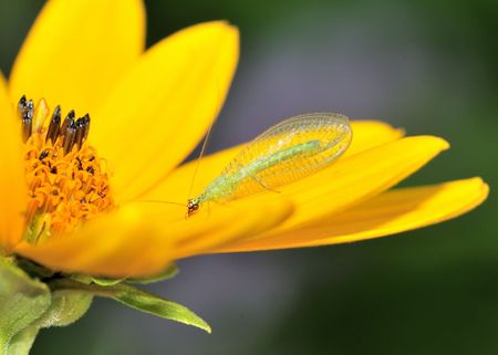 Common Goldeneye Lacewing, Chrysopa carnea on yellow flowers