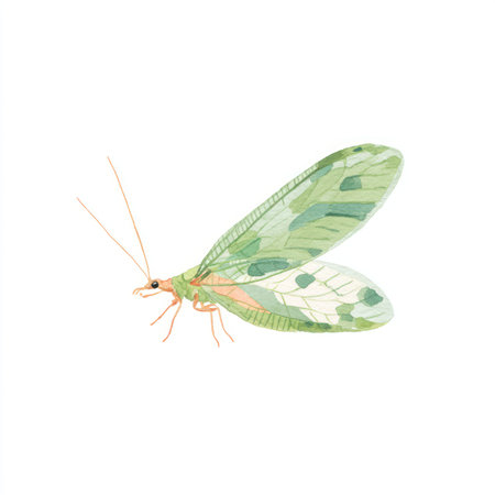 This delicate watercolor illustration features a green lacewing, showcasing its intricate wings against a simple white background, perfect for nature lovers.