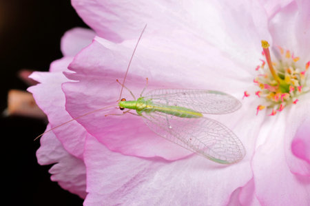 Typical Green Lacewing of the Genus Ceraeochrysa in a flowering plant