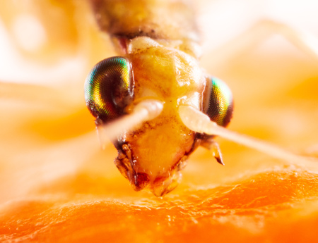 Common green lacewing fly or stinkfly in closeup macro image against blue sky