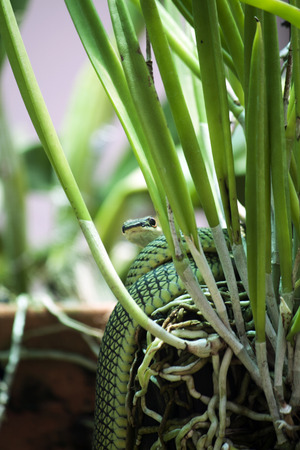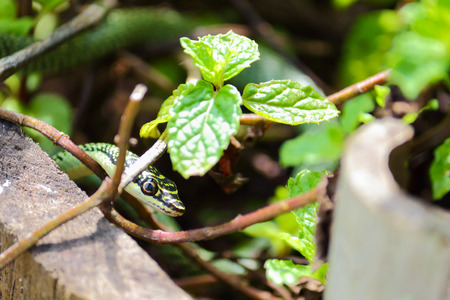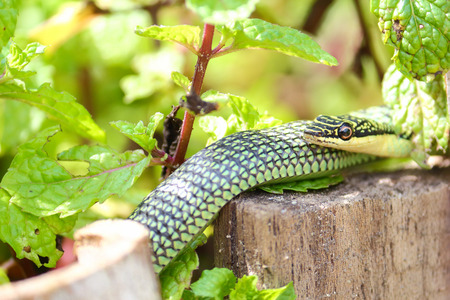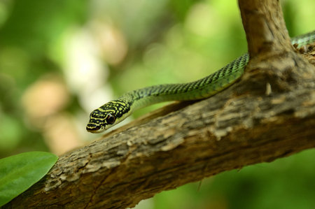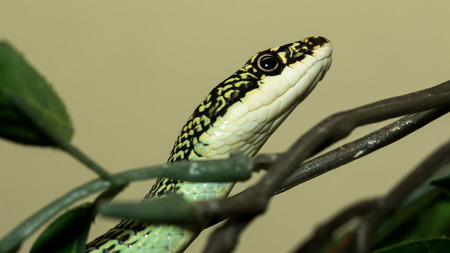 Close-up of the green snake ,Golden Tree Snake (Chrysopelea ornata) in the nature