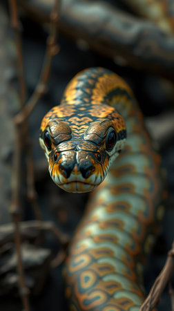 Captivating close-up of a serpent curled in a natural habitat with intricate scales and expressive eyes