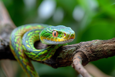 Colorful snake curled up on a branch in a lush tropical environment displaying its intricate patterns and vibrant colors