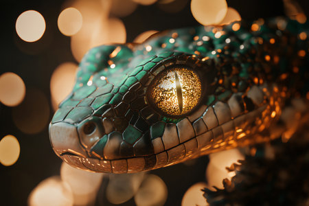Green snake shining in a forest setting with glowing highlights on its scales, curled up on a branch, surrounded by bokeh lights