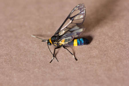 The moth perched on the leaf. Tropical insect with the scientific name Euchromia horsfieldi