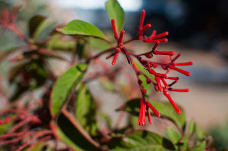 Jatropha flowers and green leaves. Blooming shrub with small red flowers. Background with exotic plant