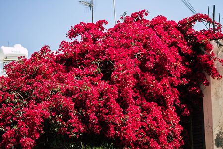 Bougainvillea bush with flowers of beautiful bright red color with green leaves. Street bush in Israel. Beautiful plant. Heat-resistant plant in the Mediterranean climate. Flowering year round