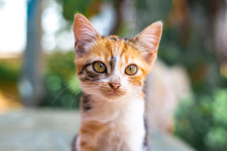 A ginger little spotted kitten with a long mustache looks. Lovely pets. Care and care