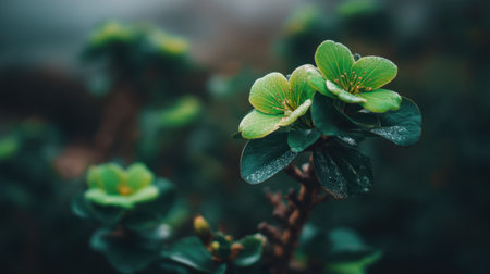 A captivating close-up of dew-covered green flowers with vibrant petals and lush leaves, set against a softly blurred background, perfect for nature lovers.