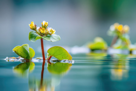 Detailed close-up view of a plant with bright yellow flowers and lush green leaves, floating serenely on the surface of calm water. The water's surface reflects the plant's image with stunning clarity. The soft, natural light enhances the colors and textures of the scene.