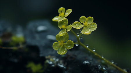 Gentle yellow woodland flowers bearing raindrops on petals, showcased against a soft-focus, atmospheric dark background in natural light.