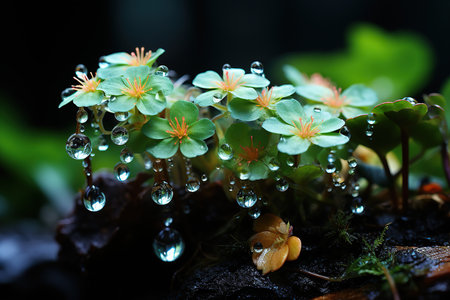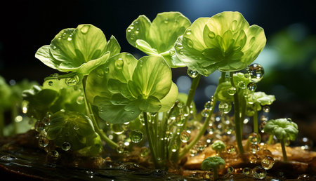Close-up shot of aquatic plants glistening with water droplets. Nature's beauty in macro photography.