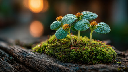 Three small plants with vibrant green leaves and yellow flowers sprout from a bed of lush green moss atop a weathered log, bathed in the warm glow of the setting sun.