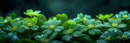 A captivating close-up of vibrant green flora adorned with glistening water droplets, showcasing the delicate beauty of nature in a tranquil environment.