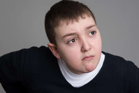 Offended child looks into the camera from behind his back. Crying boy in studio on an isolated background. High quality photo.