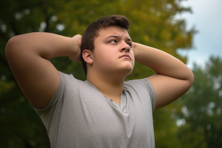 Sad overweight boy in tight clothes sitting on bench and looking aside with pensive eyes. Generative ai portrait