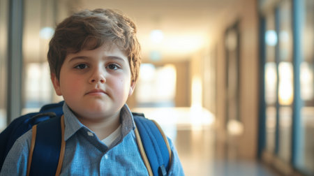 A young boy in a school uniform stands in a corridor, visibly upset after experiencing bullying for his weight at school.