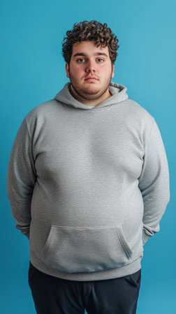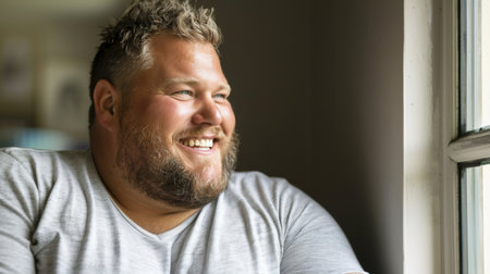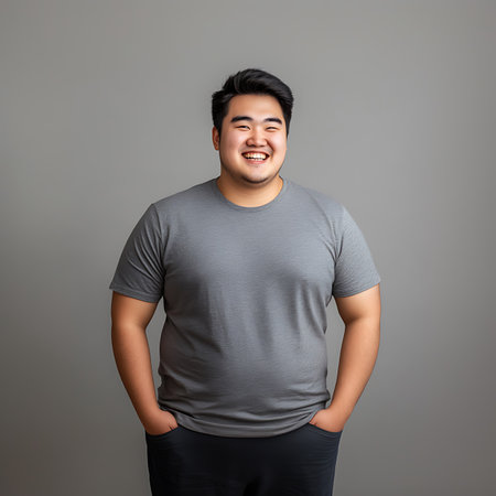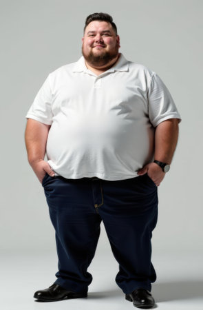Overweight man is smiling while standing with his hands in his pockets in a studio setting, conveying body positivity and self-acceptance