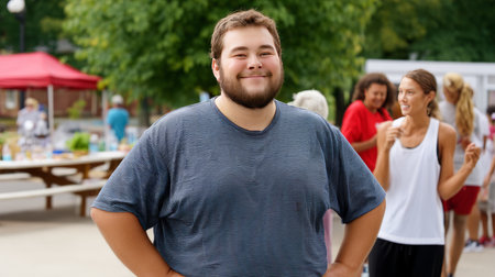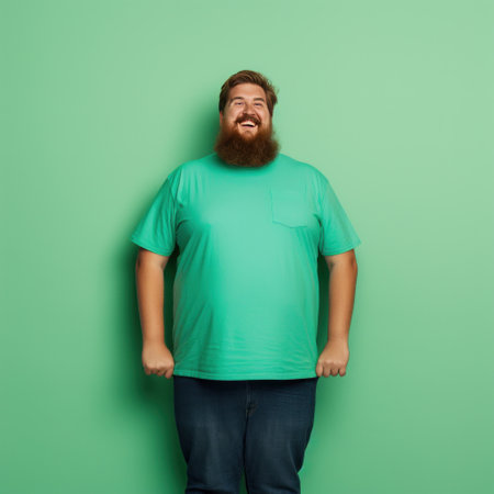Health awareness: Closeup of overweight man in tight shirt, highlighting the importance of self-care and embracing body positivity