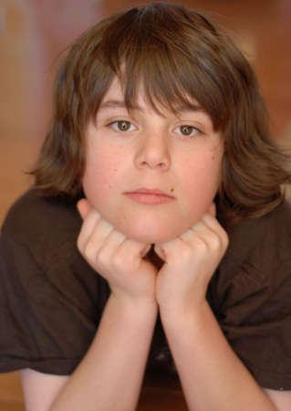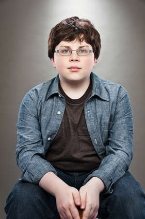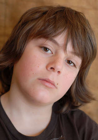 Young boy looking up with hope in his eyes against grunge background flash lit 3 light sources