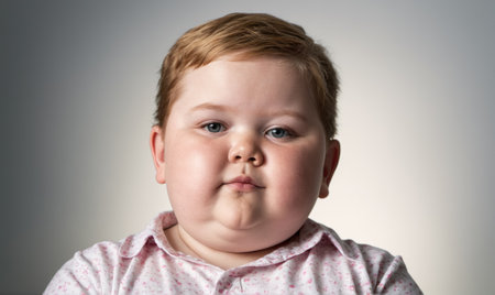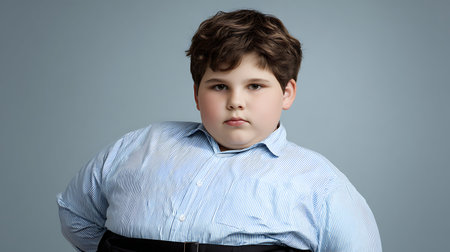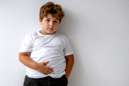 Overweight young boy standing against a white wall, holding stomach, experiencing pain
