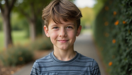 A cheerful young boy stands confidently on a pathway in a park, showcasing his bright smile. Sunlight filters through the trees, enhancing the serene atmosphere of the outdoor setting.