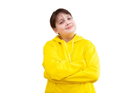 Studio shot of teen 12 year old girl in yellow hoodie , standing against white background