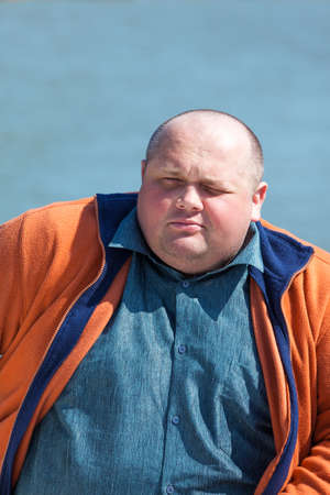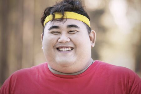 Close up of young fat man smiling at the camera while wearing sportswear in the park at autumn time