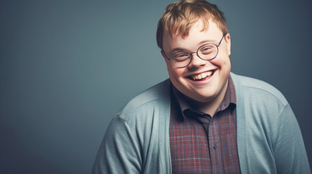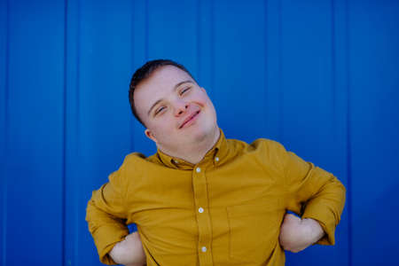 Happy young man with Down syndrome smiling and looking at camera against blue background.