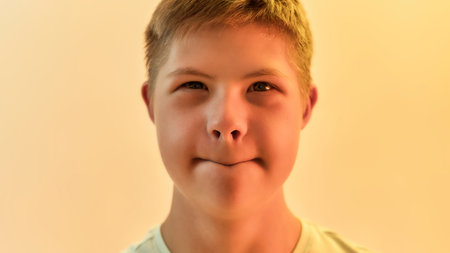 Portrait of smiling laughing teenager guy with Down syndrome creamy beige background. Advertising children's cosmetics, products, hair care products, medicines, perfumes, cosmetology, courses, schools, colleges and trainings. Genetic disease world day