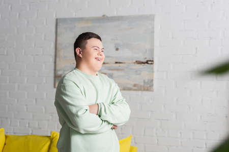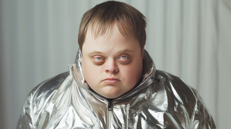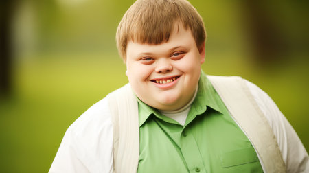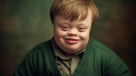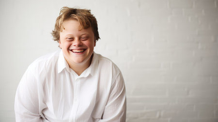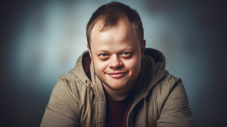 young man with Down syndrome is captured in a touching moment. He has a bright, joyful smile that radiates happiness.